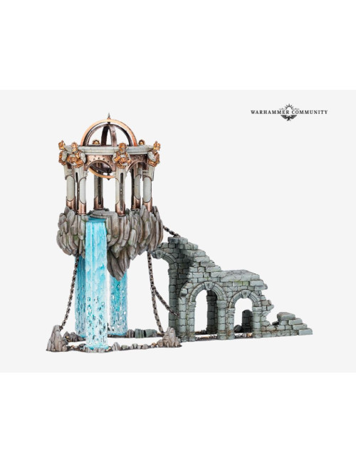 Con este kit multicomponente de plástico puedes montar un Aqualito purificador, una magnífica pieza de terreno ambientada en las Cruzadas Portamanecer para tus partidas de Warhammer Age of Sigmar. Este santuario flotante lucirá estupendo en cualquier campo de batalla, y también puede combinarse con el resto de la gama de terreno de Paisaje del Reino, disponible por separado, para montar tu propio asentamiento naciente para que lo disputen bandas y ejércitos.