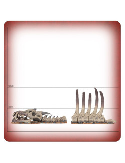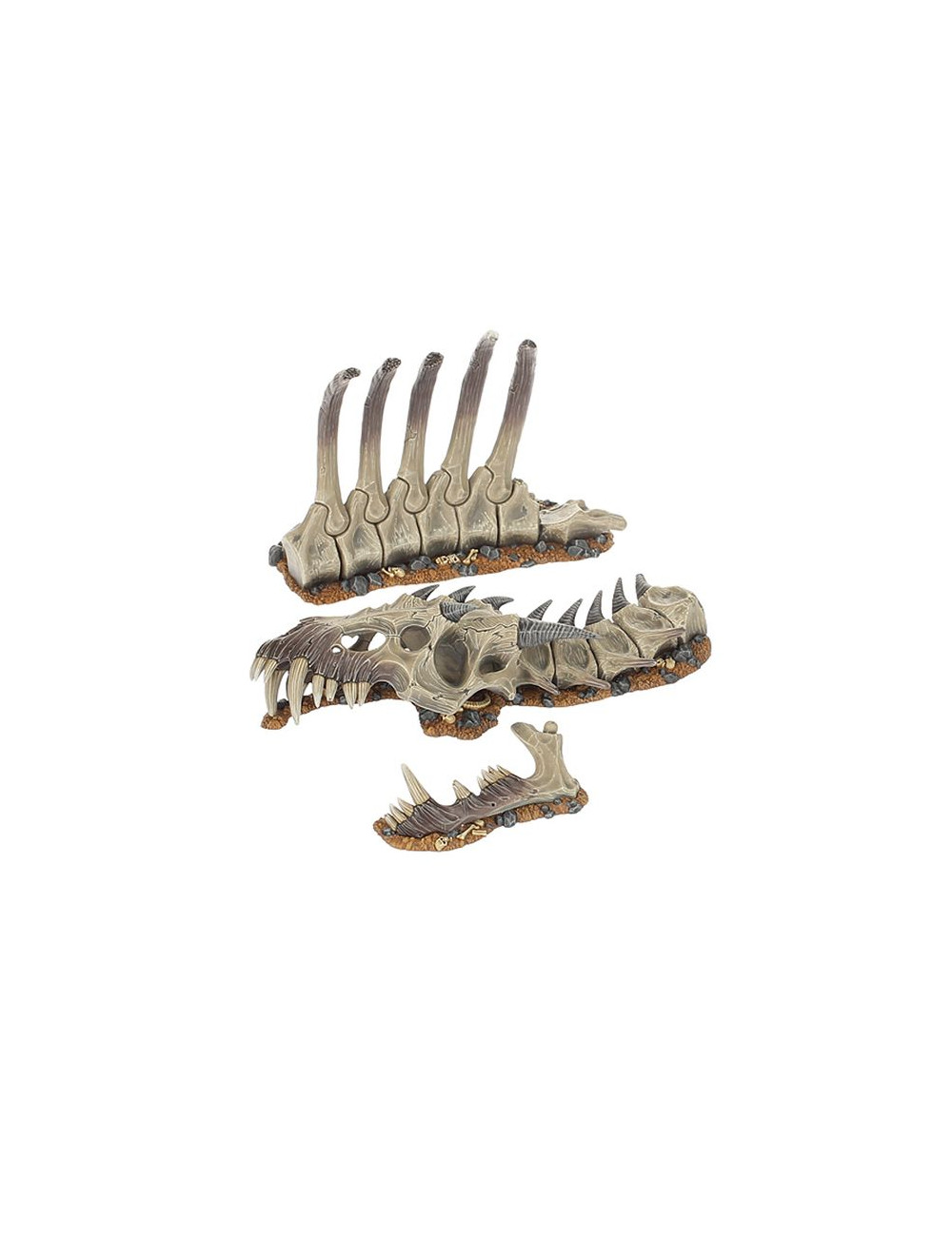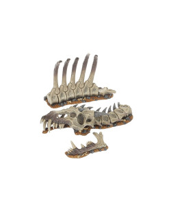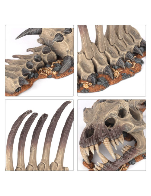 Con este kit multicomponente de plástico puedes montar Restos de Megadroth, una pieza de terreno para Warhammer Age of Sigmar. Todo lo que queda de este es la cabeza, la columna vertebral y algunas costillas rotas. Esta imponente pieza es ideal para representar el salvaje reino de Ghur, y brinda a tus unidades con algo de cobertura tras la que avanzar. La mandíbula puede montarse abierta o cerrada.