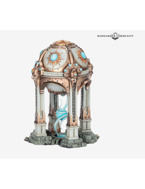 En el centro de toda fortaleza sigmarita se levanta un Sifón de nexo. Estas construcciones mágicas están diseñadas para extraer energía geomántica pura del reino para alimentar y proteger el floreciente asentamiento que lo rodea.